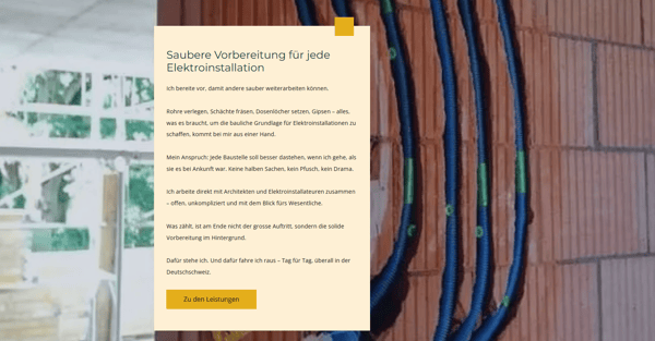 Ich bin Ihr Partner für die saubere und durchdachte Vorbereitung von Elektroinstallationen – vom Schlitz bis zur Dose. Nach vielen Jahren auf dem Bau und über 5 Jahren Spezialisierung bringe ich Struktur in jedes Projekt. Für Architekten. Für Installateure. Für starke Grundlagen.